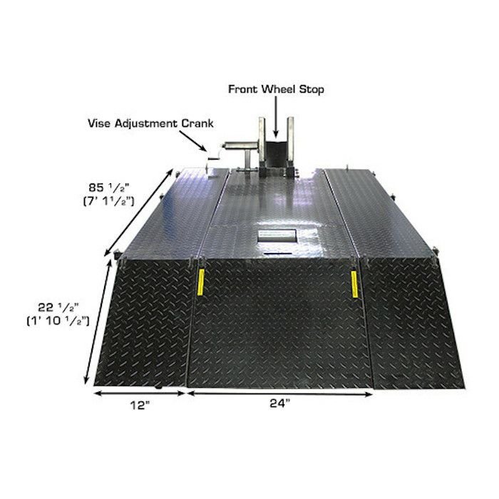 This is a complete ATV lift that includes the side extension kit consisting of two 12″ side extensions, two 12″ ramp extensions, and a wheeled dolly. The ACL XLT also includes standard the stabilizing bar, this bar provides greater stability for the raised platform by increasing the “footprint” of the lift. Many companies do not include this very important stabilizing bar in their “lift package”. Other popular features include the padded front wheel vise, a removeable rear plate that can be replaced with a dyno-roller plate, and a wheeled dolly to assist in moving the lift.
