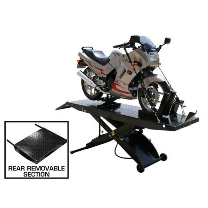 The Atlas CycleLift motorcycle lift comes standard with a 20″ removable rear section. This 20″ section can be easily removed so that a rear tire can be “dropped straight down” from the rear axle. Since the entire platform width is removed, any sized rim can be lowered from the axle.