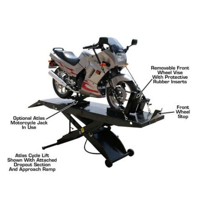 The Atlas CycleLift is air operated and requires between 90-100 PSI to operate. The CycleLift is the perfect addition to any service department of professional motorcycle dealers or is a great motorcycle lift for the person who wants to work on his personal bike in their own garage.