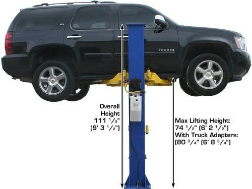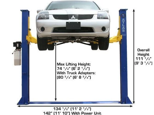 Buy NowThe Atlas® 9KBPX is an economically designed baseplate two-post lift great for low ceiling garages. The total column height of 111 ½” (9 feet 3 ½ inches) allows this lift to be installed in almost any professional or home garage with a ceiling as low as 9 feet 6 inches. The Atlas® 9KBPX “chain over roller” lift features a spring loaded Secondary Lock System (SLS) that automatically engages in the event of a slack or broken chain. The reliable dual chain-drive cylinders, symmetric arms, and automatic arm restraints make this the perfect choice for “Mr. Homeowner” or small commercial shop looking to service cars, SUV’s and light duty trucks (not recommended to lift Diesel Dually or other large trucks).