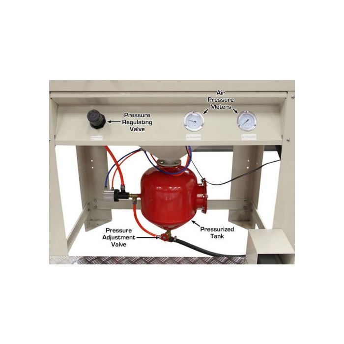 The P990 pressurized sandblast cabinet features a higher velocity stream that allows work to be done up to 4 times faster than other sandblast cabinets on the market. The direct pressure system which pneumatically pushes the blast media through the air hose, makes it is possible to clean hard to reach areas that are impossible with other sandblast cabinet models. The P990’s direct pressure system is best utilized on heavy steel or extra thick coatings that require additional friction on the surface to be removed. But the P990 also comes equipped with a pressure valve to lower the blasting pressure for more sensitive parts.