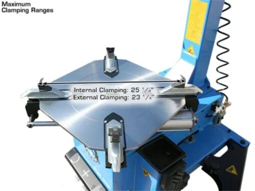 The Atlas wheel clamp tire changers are designed to change the tires on both high priced alloy wheels and steel wheels without damaging the rim or the tire. The powerful bead breaker located on the side of the machine is designed to break even the most stubborn and rusted beads without damage to the rim. The turntable jaws (which can be covered with plastic covers) hold the rim securely without damaging the surface of the rim. These jaws can be moved to three different positions along the slide of the turntable to either increase or decrease the clamping range, and to handle the widest variety of tires.