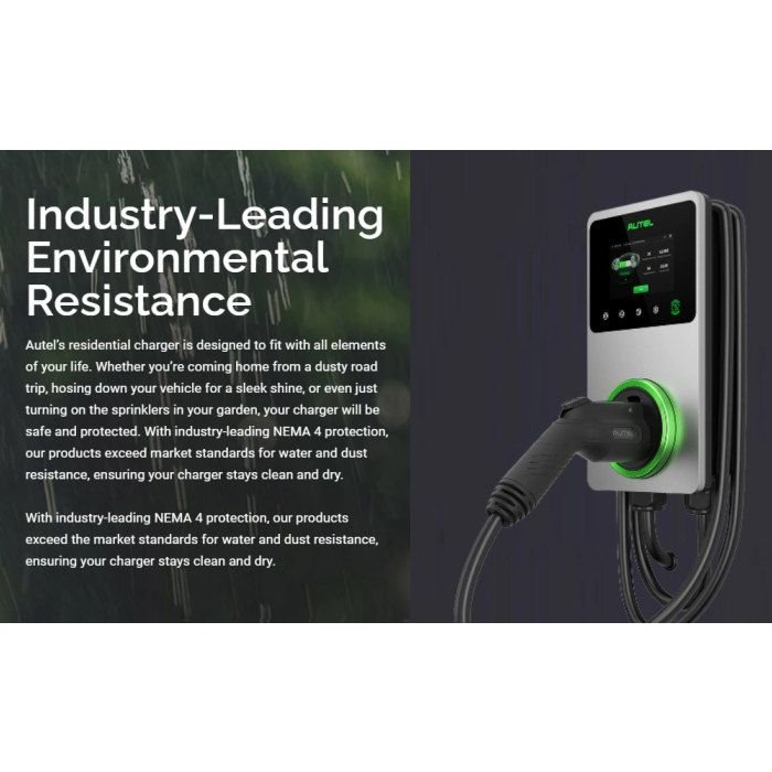 Autel’s residential charger is designed to fit with all elements of your life. Whether you’re coming home from a dusty road trip, hosing down your vehicle for a sleek shine, or even just turning on the sprinklers in your garden, your charger will be safe and protected. With industry-leading NEMA 4 protection, our products exceed market standards for water and dust resistance, ensuring your charger stays clean and dry. With industry-leading NEMA 4 protection, our products exceed the market standards for water and dust resistance, ensuring your charger stays clean and dry.