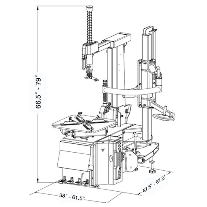 Mount-demount arm automatically rotates and lowers into position. Utilizes pneumatic control and high quality locking system with roller guides.