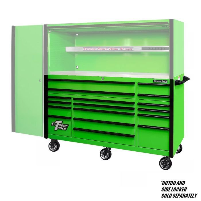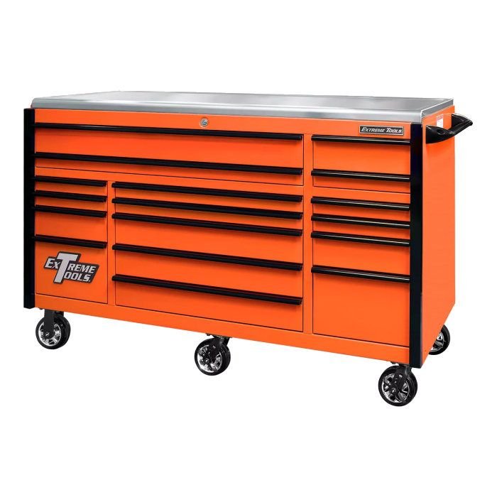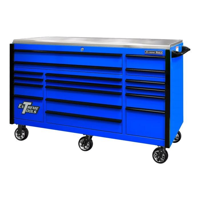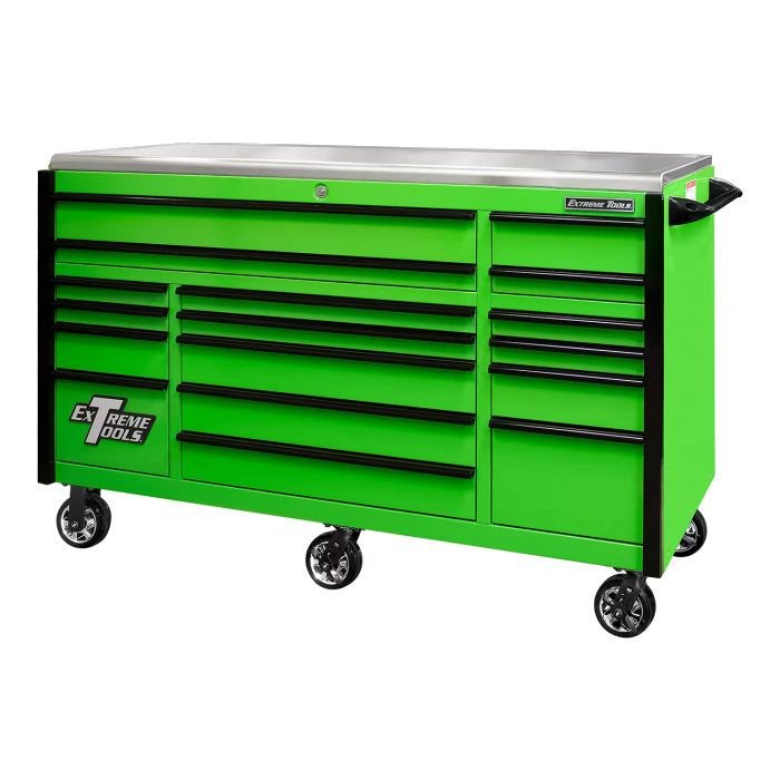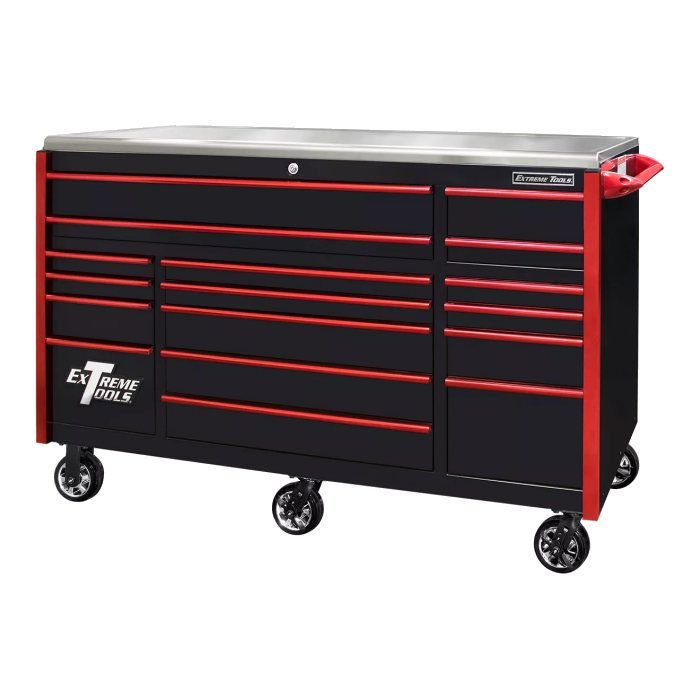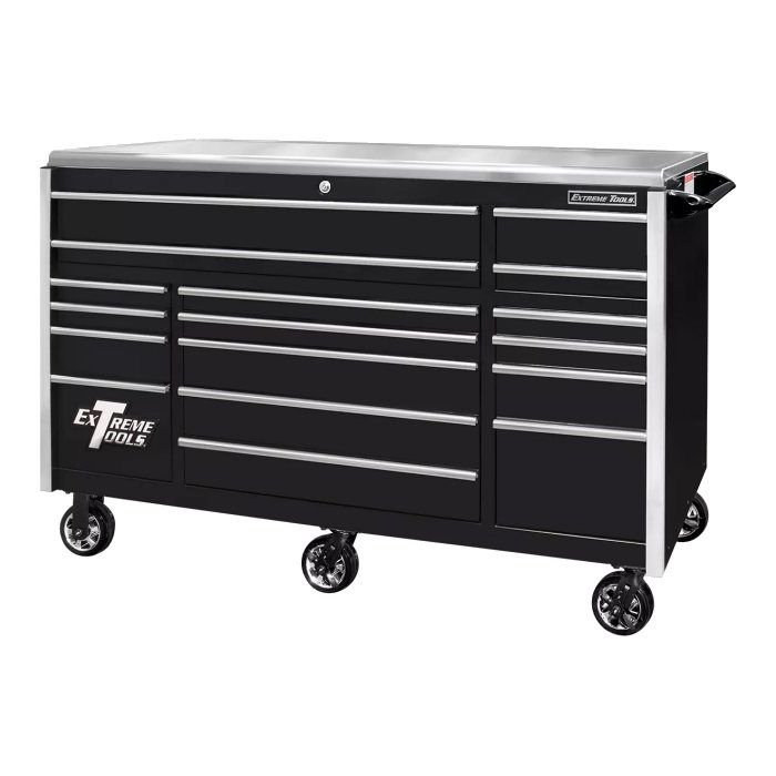 Buy NowExtreme Tools EX Professional Series 72″ 17-Drawer Rolling Cabinet is the ULTIMATE tool box in the EX Professional Series with our patented Quick Release drawer pulls. We have taken our flagship EX Professional Series with all its patented features and combined it with our state-of-the-art, upgraded Quick Release self-latching drawer pulls. Our goal? To create the most innovative, stylish, durable and Professional 72 Inch Triple Bank Roller Cabinet on the market.