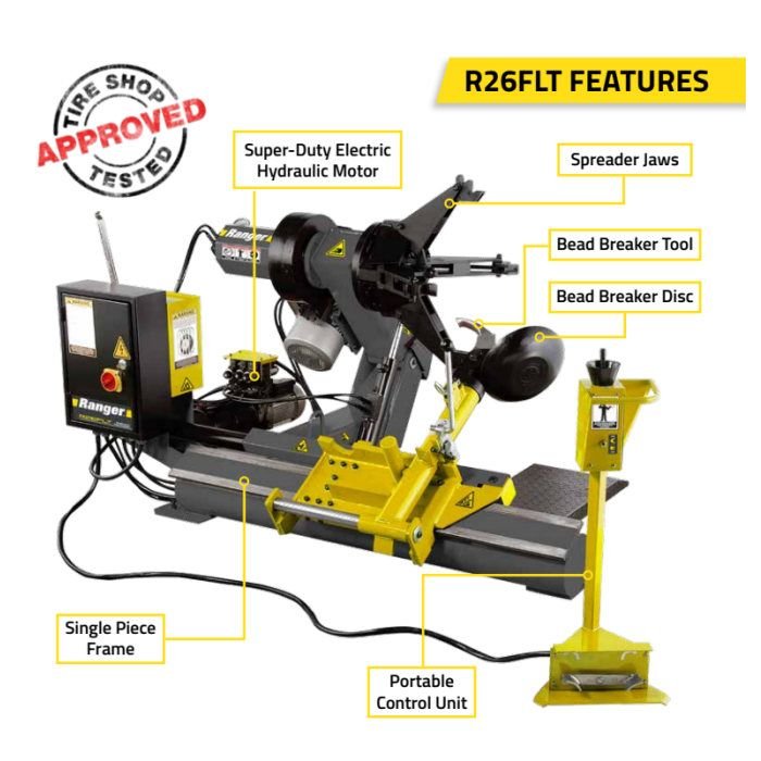 The Ranger R26FLT is a heavy-duty tire changer that handles truck, bus and commercial van tires with ease. Comes with joystick control.