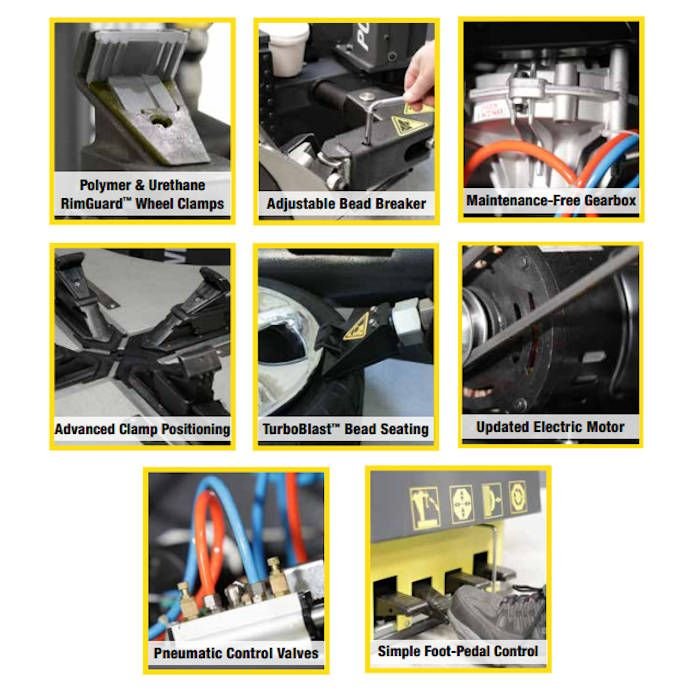 A high-torque electric turntable drive features increased speed and reversible direction for quicker tire removal and installation. Controlled speed gives low profile and run-flat beads time to relax and reduces the risk of tire damage.