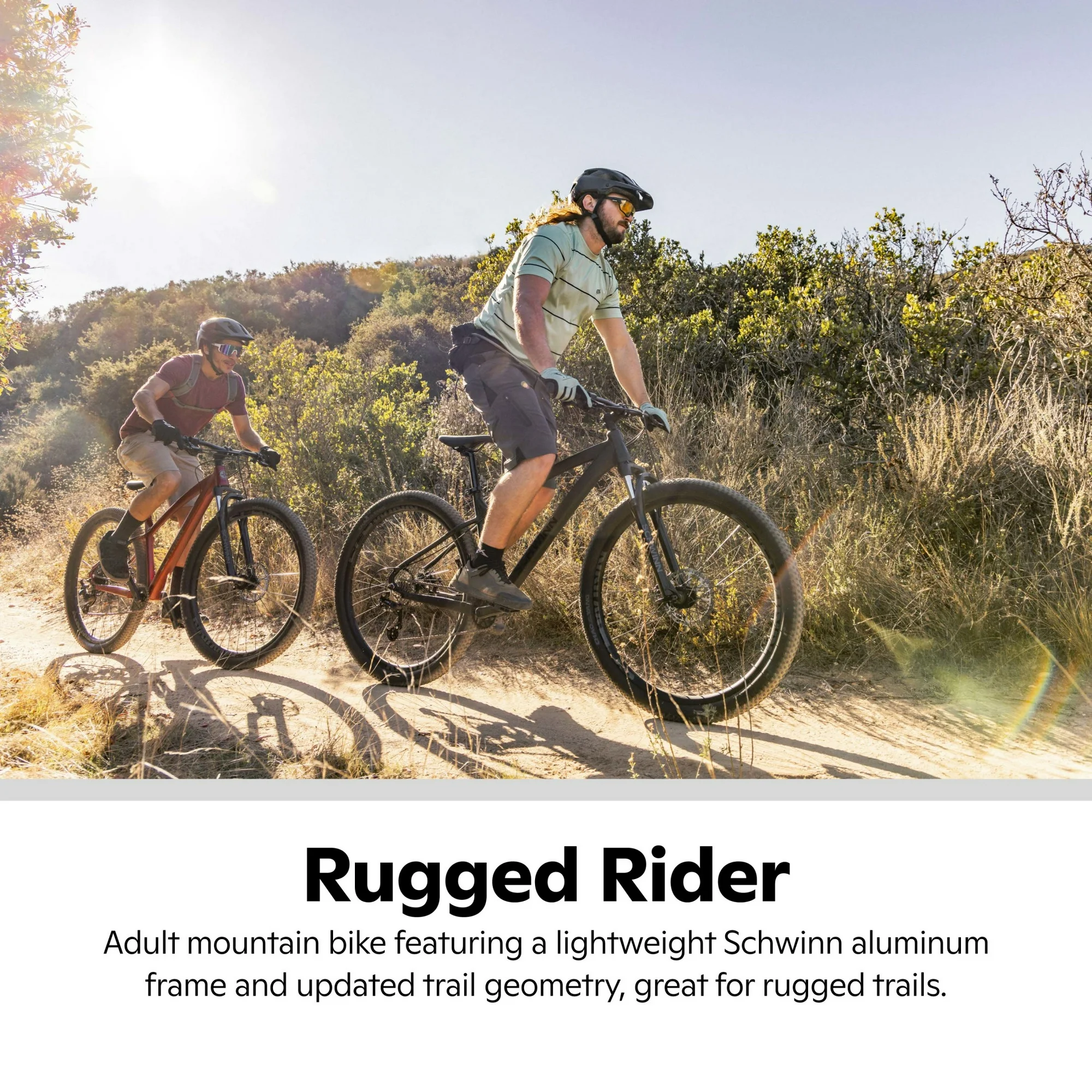 - Adult mountain bike featuring a lightweight Schwinn aluminum frame and improved performance, great for rugged trails. 29-inch wheels fit riders between 5′ 4″ and 5′ 8″ tall. Unisex.