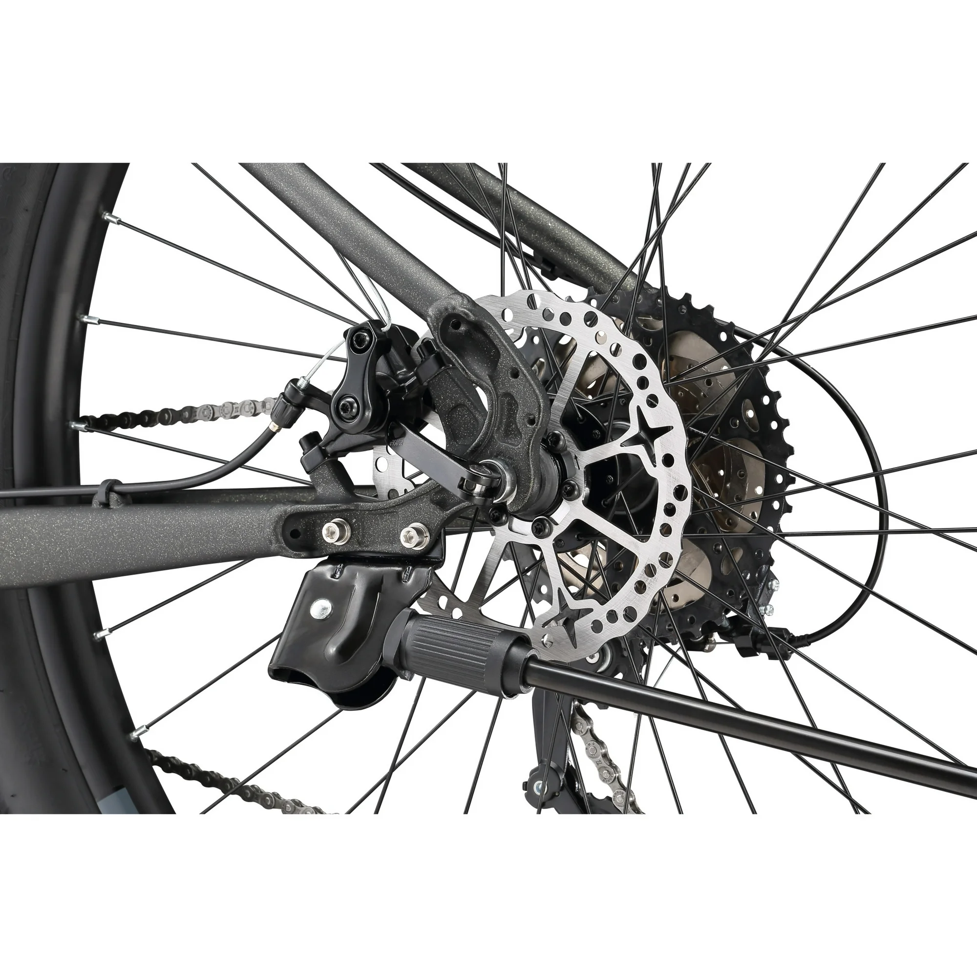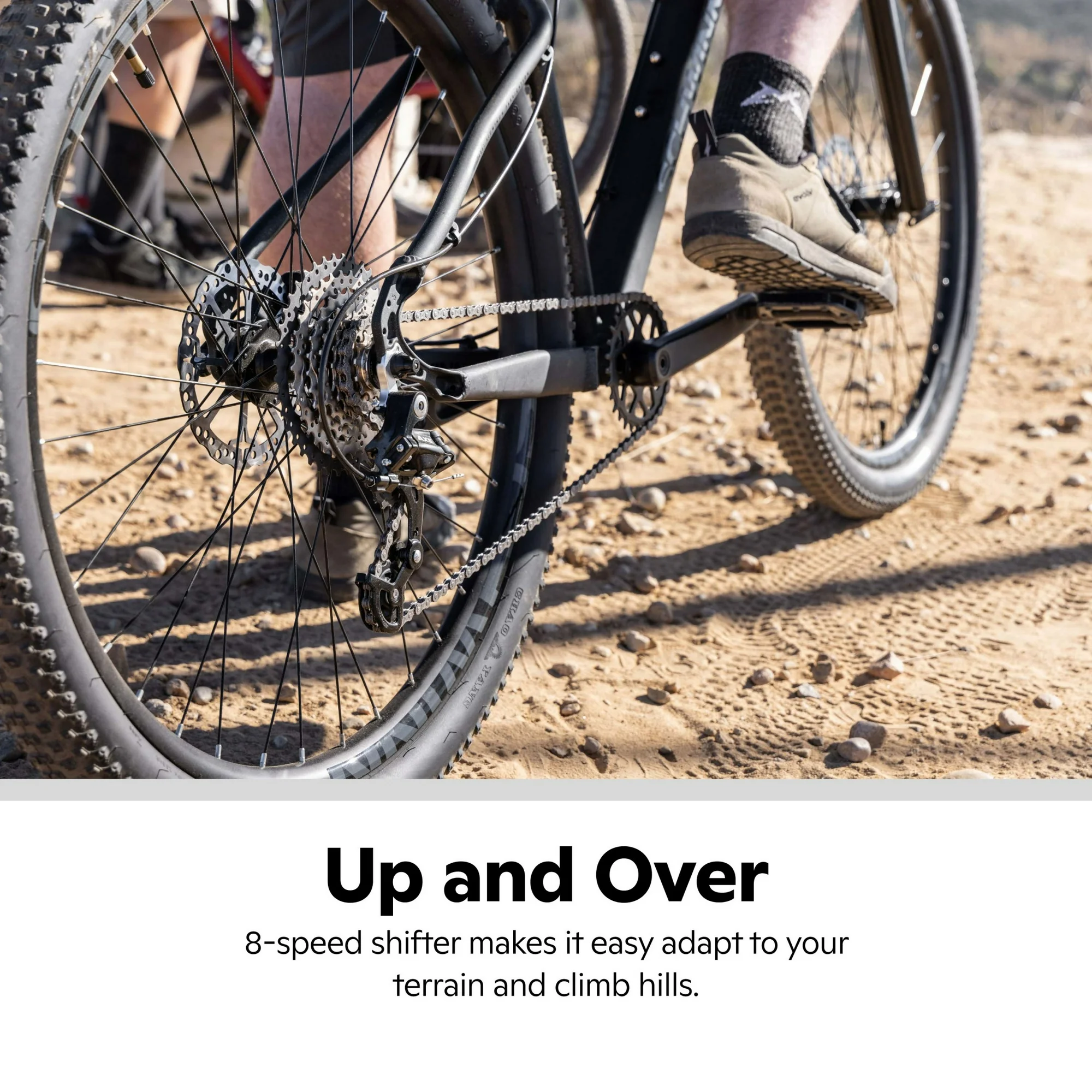 - 2.6-inch-wide mountain tires and wide rims offer extra grip and stability.