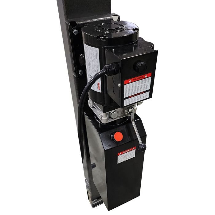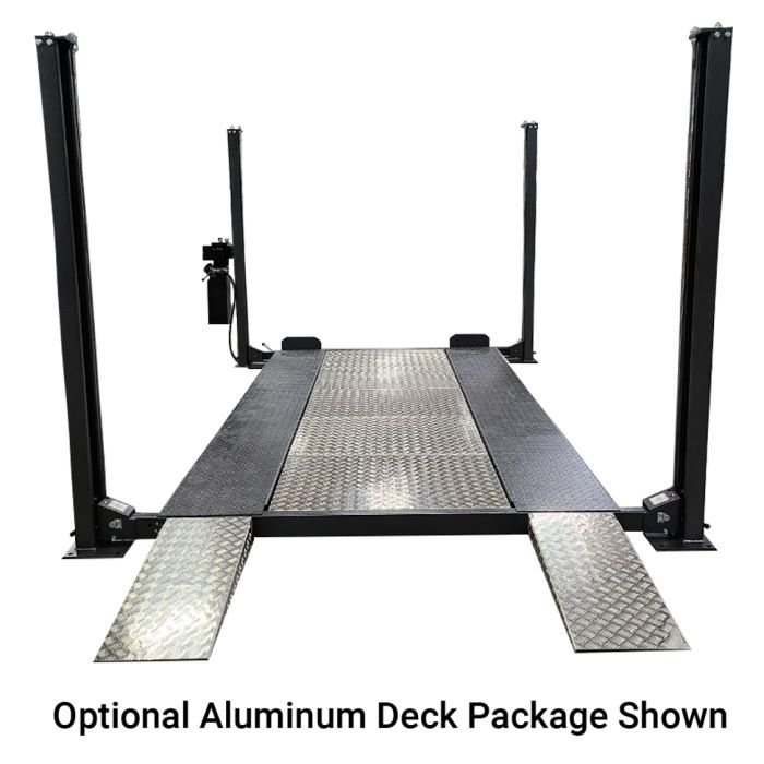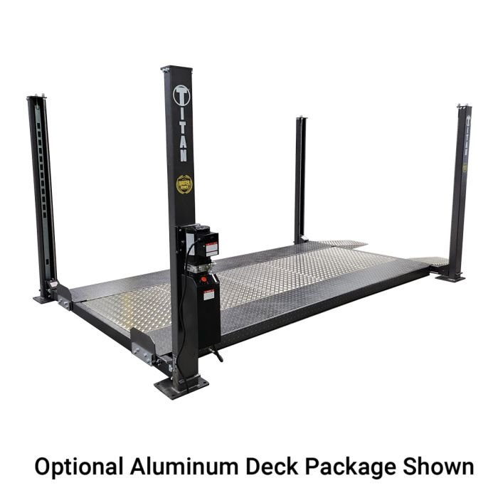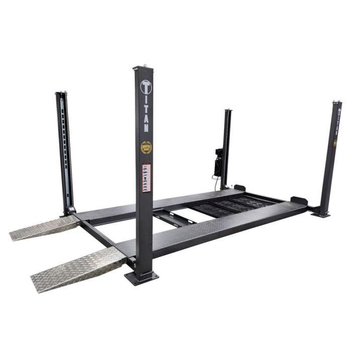 The Titan Master Series 4-post parking / storage lifts are an ideal choice for automotive enthusiasts needing extra garage space for a car, boat, lawn equipment, etc. The 110-volt motor allows for easy adaptation into a garage or workshop in any residential application. Easy operation lock release handle located by the power unit will minimize bending or squatting during operation. The internal linkage rods are sleek and hidden, while still accessible for adjustments if needed. This feature makes the Master Series a perfect lift for the individual who may work on their vehicle while on the lift. Includes aluminum ramp kit, caster kit, (3) drip trays, tool tray, and (2) wheel stop plates.